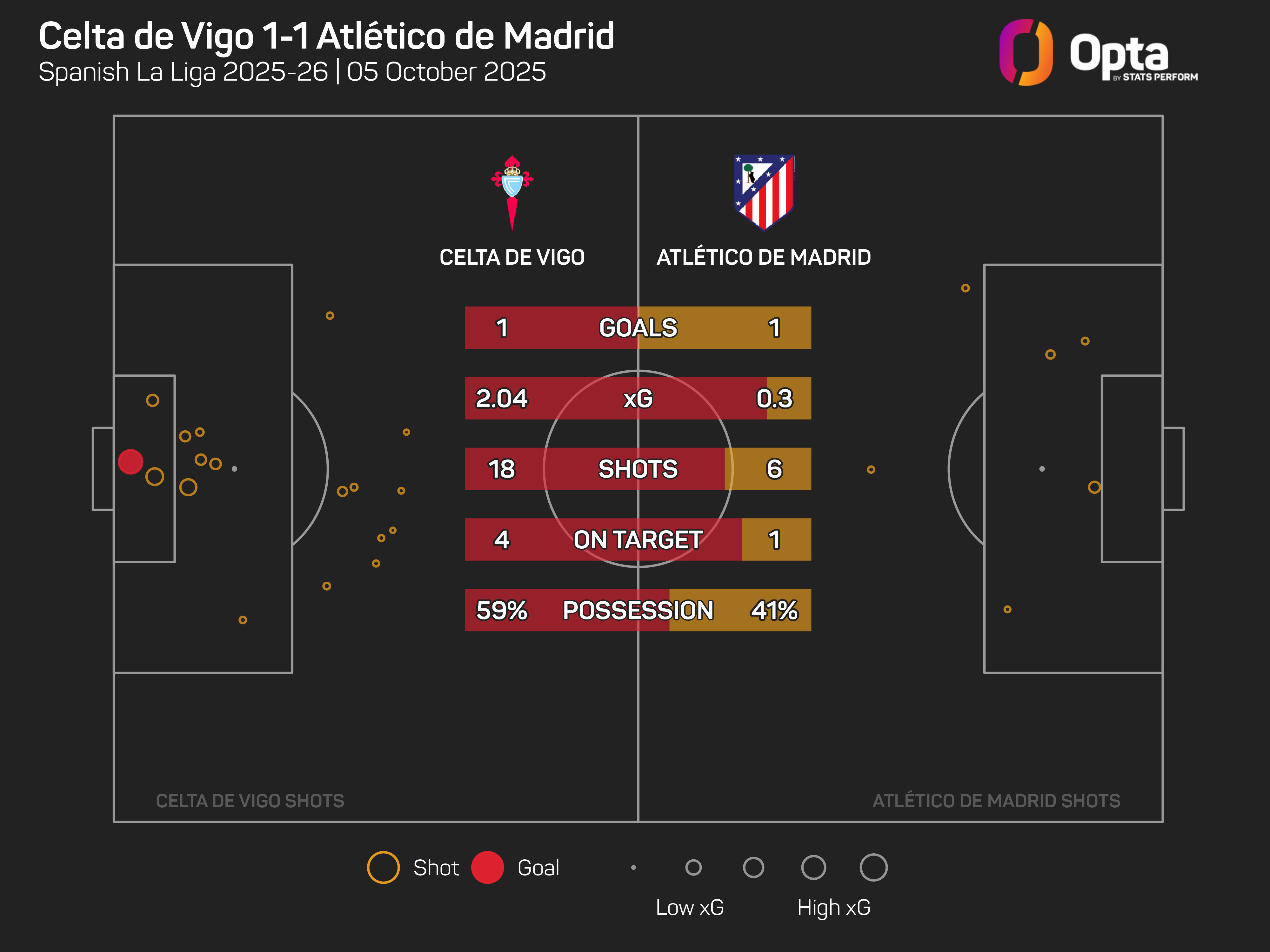 Celta will look back at this game as the one that got away having failed to find that elusive first win of 2025-26, with this result made even more frustrating having generated an xG total of 2.04 from their 18 shots to Atletico's 0.3 from their six attempts.